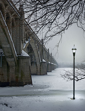 If the lightness of the snow in the central river area continued to the bottom of the image the sense of a base or support would be missing, so the shadowed snow tones contribute to the balance. The visual weight of the large bridge abutment on the left is the balance point around which the entire image is anchored. The space between the elements is the negative space that becomes an element of its own in composition. This is where learning to feel composition becomes necessary because no set of rules or guidelines in a camera viewfinder or a Photoshop tool will guarantee you that the image you make will work visually. Only your sense of balance and the experience of seeing many images will make that happen.