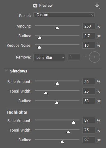 The bottom half of the dialog is a simpler application of the Blendif controls. Amount is simply how much to reduce the effect of the sharpening. The tonal width is the percentage of the image tonal range to use to reduce the sharpening effect. I recommend starting with about 50% reduction on 25% on the tonal width of the shadows and higher numbers in the highlights. The radius setting in the shadow and highlight controls determine how far to look from any pixel to consider it to be within the range of the tonal width. The larger the radius to more subtle the transition between affected areas, so low radius values are not usually as valuable. These transitions can be very subtle in any case and difficult to see in many images. This is why a more or less standard set of values can be used as a starting point and only modified if those values do not work for a particular image.